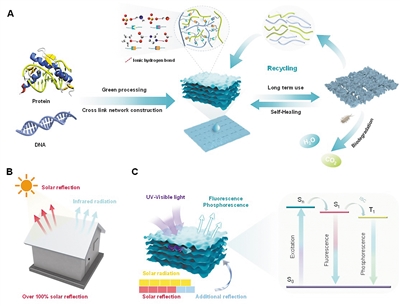 Combining DNA and gelatin, researchers converted absorbed ultraviolet light into visible light. The material has a visible light reflectance exceeding 100 percent and is able to yield a large cooling effect.