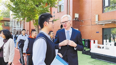 | Danish chemistry Professor Troels Skrydstrup talks about the environment with a Chinese student. (COURTESY PHOTO) |