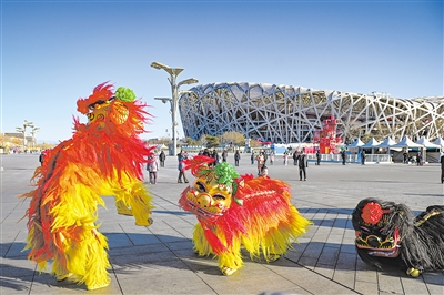 Performers showcase the Baizhifang Lion Dance in front of the Bird's Nest stadium in Beijing on February 12, celebrating the Lantern Festival. (PHOTO: XINHUA)