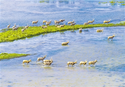 ① Milu deers are photographed in the Yellow Sea Wild Deer Wetland in Dafeng district, Yancheng city, Jiangsu province.