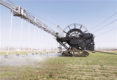 A self-propelled sprinkler irrigates a wheat field in Dongtianzhuang town, Fengnan district of Tangshan, north China's Hebei province, March 17, 2025. (PHOTO: XINHUA)