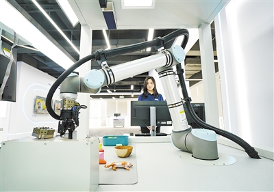 | A company employee demonstrates the operation of an industrial robot in the Zhongguancun Science and Technology Park in Xiong'an New Area. (PHOTO: XINHUA) |