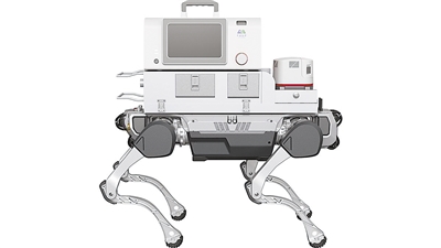 The quadrupedal emergency transport robot can swiftly carry injured individuals while utilizing its side-mounted portable emergency medical system to perform "in-motion emergency treatment."