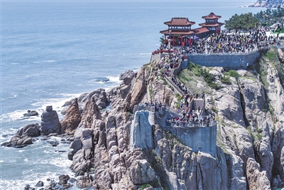 | This aerial drone photo taken on May 3, 2025 shows tourists enjoying the view of Chengshantou in Rongcheng city, east China's Shandong province. (PHOTO: XINHUA) |