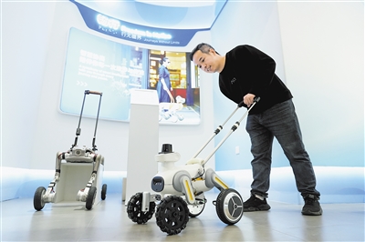 | A guest interacts with a smart guide dog. It leverages AI models to provide daily companionship, emotional support, and features like path planning, autonomous navigation, and voice interaction. |