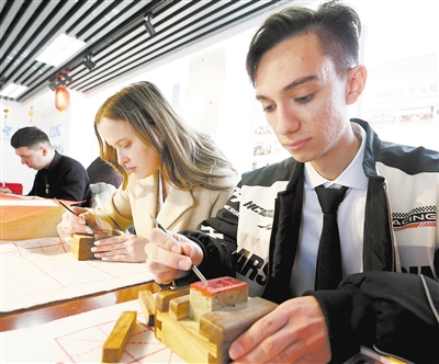 | Foreign students at China University of Geosciences learn Chinese seal engraving to celebrate the Chinese New Year. (PHOTO: VCG) |