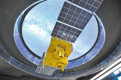 | This is a model of the "Mozi" quantum satellite in the technology experience hall of the China Telecom Quantum Group. (PHOTO: XINHUA) |