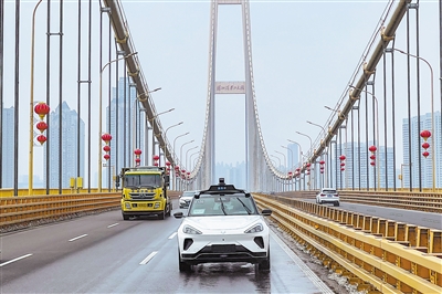 | A Baidu driverless car drives on the Yangsigang Yangtze River Bridge in Wuhan, Hubei province. (PHOTO: VCG) |