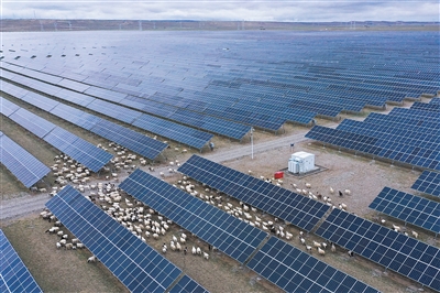 | A flock of sheep roaming between solar panels at a solar photovoltaic power plant in Qinghai province. (PHOTO: XINHUA) |