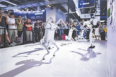 China Mobile's self-developed robot dogs and humanoid robot dance in the company's booth during the 2025 World AI Conference in Shanghai, July 27, 2025. (PHOTO: XINHUA)