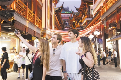 | Tourists from Spain take a selfie at Yuyuan Garden Mall in Shanghai, eastern China. (PHOTO: XINHUA) |