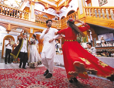 | A tourist from Pakistan (2nd from the right in the front row), dances with a local resident at the homestay in Kashi, Xinjiang on September 10. (PHOTO: XINHUA) |