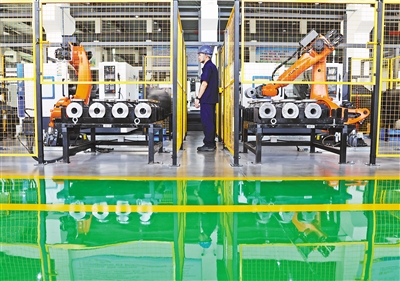 | An employee works with collaborative robots in a valve production workshop in Yancheng city, Jiangsu province. (PHOTO: XINHUA) |