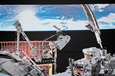 This screen image captured at Beijing Aerospace Control Center on December 9, 2025 shows Shenzhou-21 taikonauts Zhang Lu and Wu Fei (R) performing extravehicular activities outside China's orbiting space station. (PHOTO: XINHUA)