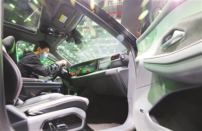 | A visitor experiences the intelligent system of the Arcfox series of pure electric vehicles at an exhibition in Shanghai. (PHOTO: XINHUA) |