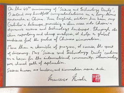 On the 40th anniversary of S&T Daily, I'm delighted to extend my warmest congratulations. As a scientist who has worked in China for over a decade, I offer these wishes with the same kind of poetic warmth you might feel from the Tuscan sun.