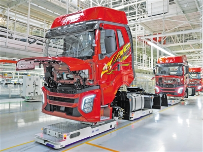 | Vehicles are carried along the production line by robotic transporters at a factory of FAW Jiefang, January 4, 2026. (PHOTO: XINHUA) |