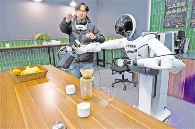 | A staff member operates a robot to collect data in a coffee shop scenario at a humanoid robot innovation center in the Wuhan East Lake High-tech Development Zone in Wuhan, central China's Hubei province. (PHOTO: XINHUA) |