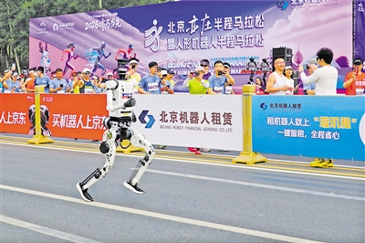 | ? A humanoid robot runs during the E-Town half-marathon on April 19. (PHOTO: ZHAO Weihua / Science and Technology Daily) |