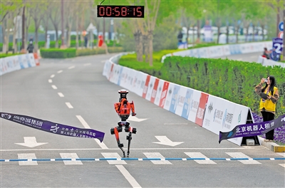 | ? The autonomous humanoid robot player Flash crosses the finish line in the E-Town half-marathon on April 19. (PHOTO: XINHUA) |